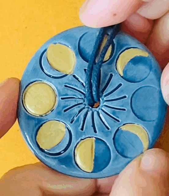 Esta pieza única de cerámica pintada a mano llega a vos con una cuerda que sirve para señalar las fases de la luna.